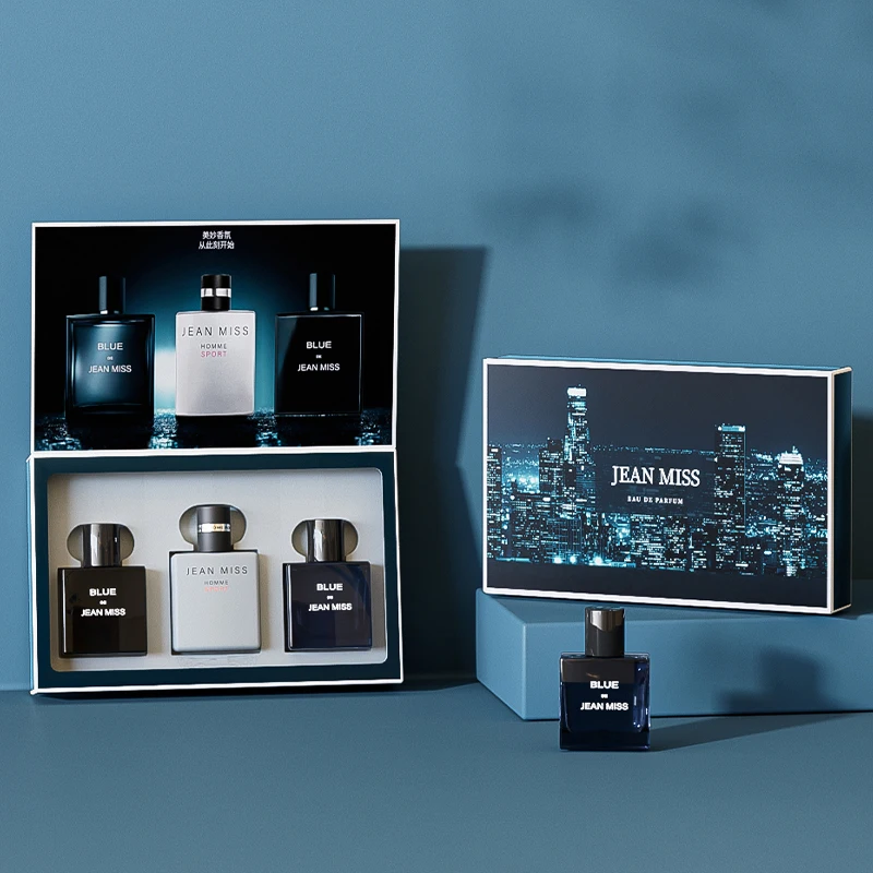 This is a boxed gift set of perfumes from the brand JEAN MISS. It includes three fragrances: two labeled BLUE de JEAN MISS and one labeled JEAN MISS HOMME SPORT. The set is designed as a luxury men’s fragrance collection, making it suitable for personal use or as a stylish gift.